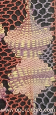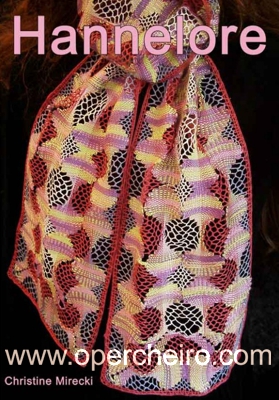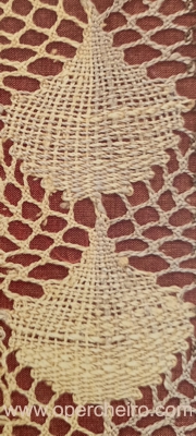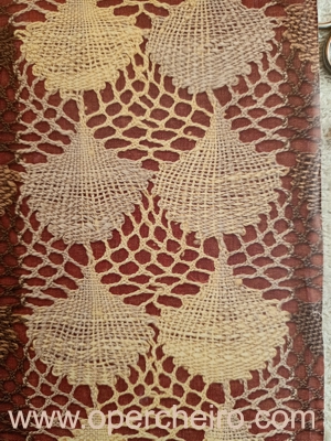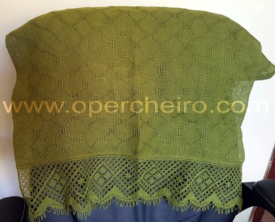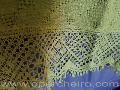 El patrón en los dos casos está compuesto sobre la base de un diseño de hojas, o conchas. Veréis como es el mismo diseño. Primero la foto del chal y después la del fular.