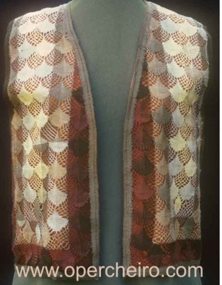 Para empezar vamos a ver las dos piezas. El chaleco está realizado en tonos crema y marrones y el fular en tonos rosa, amarillo, lila y rojo.