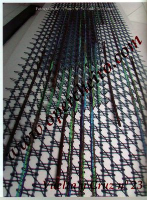 Este encaje por desgracia no se aprecia en la foto. Son tiras de encaje con bolitas de Swarovski colocados en los extremos de un chal. Está realizado con nuestra seda 120Nm, aunque nosotros no las aconsejamos para flecos ya que tiene muy poca torsión. A lo mejor conocéis algún truco para que los hilos con poca torsión se mantengan en buenas condiciones al usarlos en flecos. Diseño de Antje González.