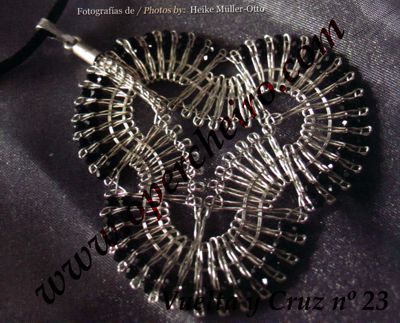 Este bonito colgante está realizado con metal pero podéis hacerlo con otro tipo de hilos y aprestar la labor para darle dureza. Nunca va a quedar igual pero si no os gusta el trabajo con metal no dejéis de disfrutar la realización de esta hermosa pieza. Diseño de Heike Müller-Otto.