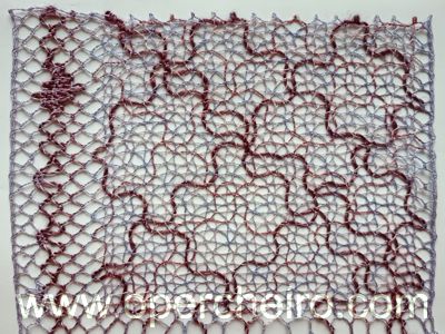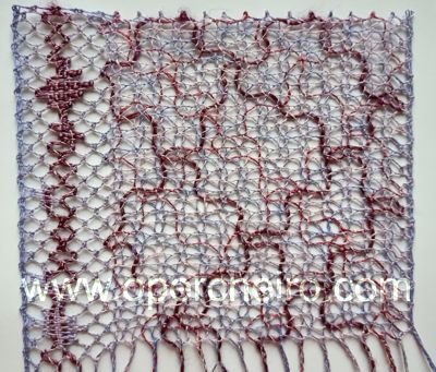 A continuación podéis ver una muestra realizada también con tres tonos de lino, hilo metalizado y seda/mohair. Las referencias del lino que utilizamos son: lila 045/3, fresa 066/2 y lavanda 071/2. El metalizado de referencia M318 lo cargamos junto con el lino fresa 066/2, y la seda/mohair ciruela es la referencia L03/2.