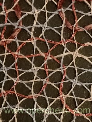 Empezamos con una muestra realizada con tres tonos de lino. Sus referencias son 069, 070 y 068. Este último lo cargamos junto con el metalizado de referencia M09. Además el hilo más grueso es la seda/mohair referencia L19. Tanto del lino cargado con el metalizado como de la seda /mohair pusimos sólo cuatro pares de cada. De los otros dos linos pusimos uno de cada color de modo alterno.